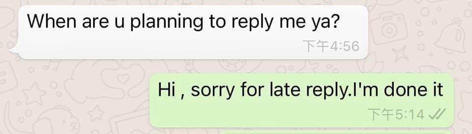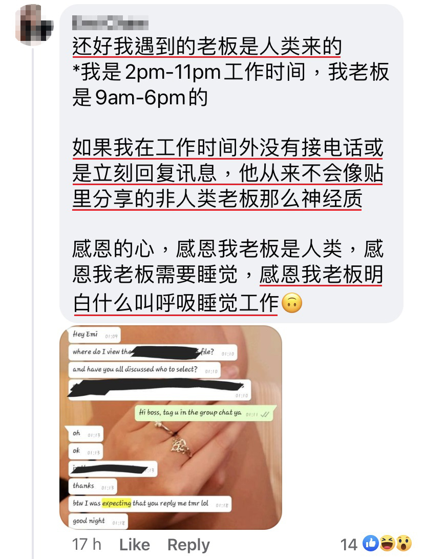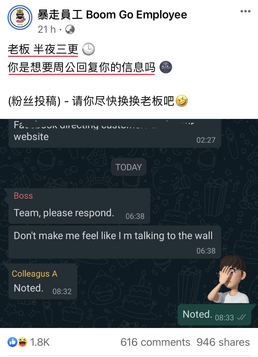 近日大马面子书粉专“暴走员工”就分享一张来自网友投稿的 WhatsApp 截图,老板竟然在凌晨2点发信息讲工作的事,结果没有员工回复让老板恼羞成怒!