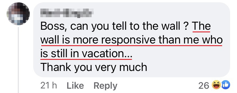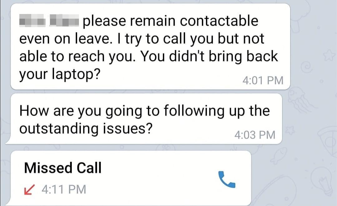 ▼「即使在休假也请你保持联系,我尝试打给你却找不到你。」