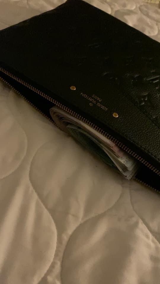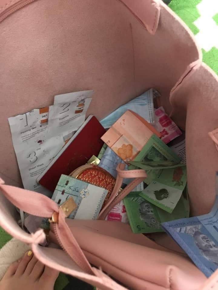 ▼ 照片中这个粉红色的女性包包,里面装着现金钞票、口罩、湿纸巾和护照等等随身物品,令人惊呆的是,包包里完全不见钱包的踪影,现金就这样散落在包包里和口罩放在一起!