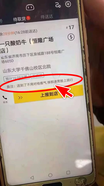 据《中国报》报导,这名外卖员在1月26日当天接获一张订单,有人点了一杯奶茶要送到山东大学千佛山校区北院去给一名男子。