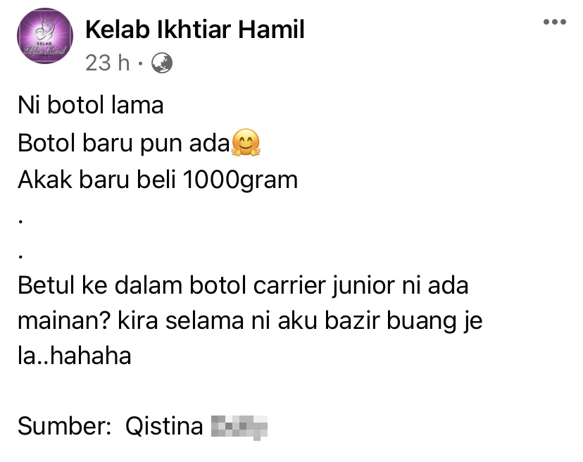 帖文里写道:「这是旧的包装,新的包装也有哦!我刚刚才买了一支容量为1000公克(1000g)的。Carrie Junior 沐浴露的瓶装内真的有玩具?算一算,原来一直以来都被我白白丢掉了…」