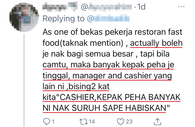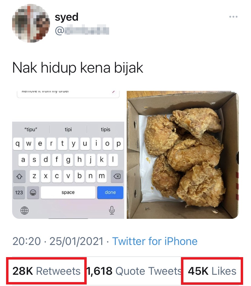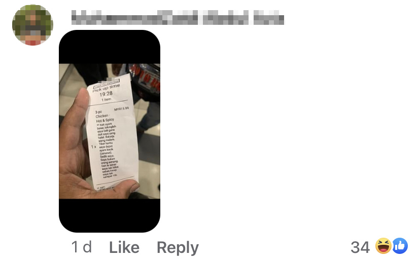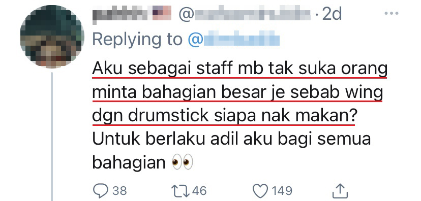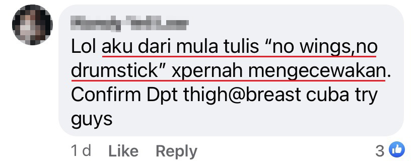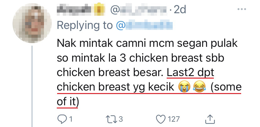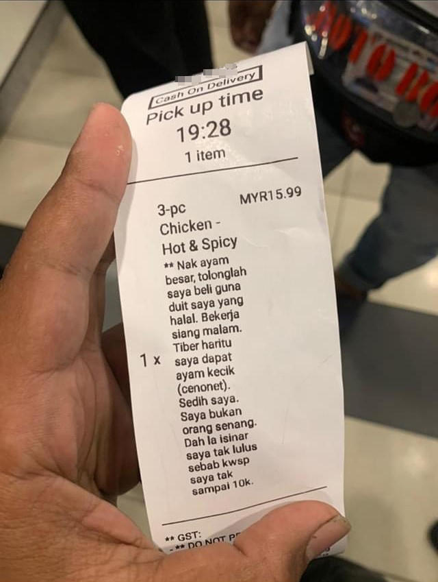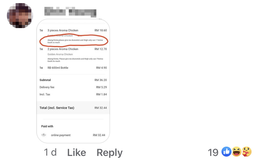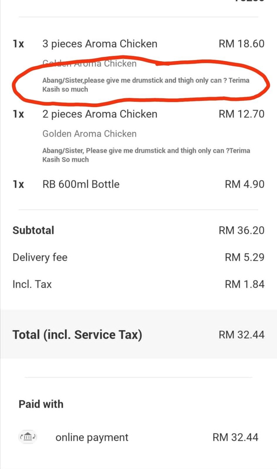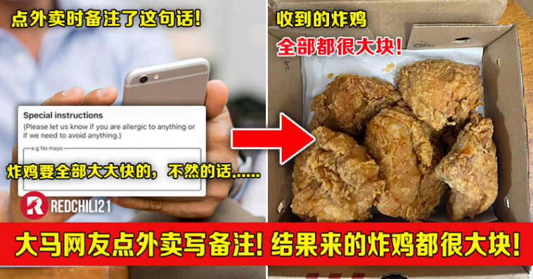 而近日网上流传一则推特推文,一名大马男子分享自己的“独门方法”,他在点外卖炸鸡的时候写下了这样的备注,结果他收到的炸鸡就如他所愿,每一块都是大大块的!