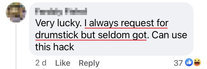 ▼ 这名网友的备注很长而且带有洋葱:「我工作很辛苦,日子也过得不顺利,上次我拿到小块的炸鸡,我很伤心,今天我真的很想吃大块的炸鸡。」