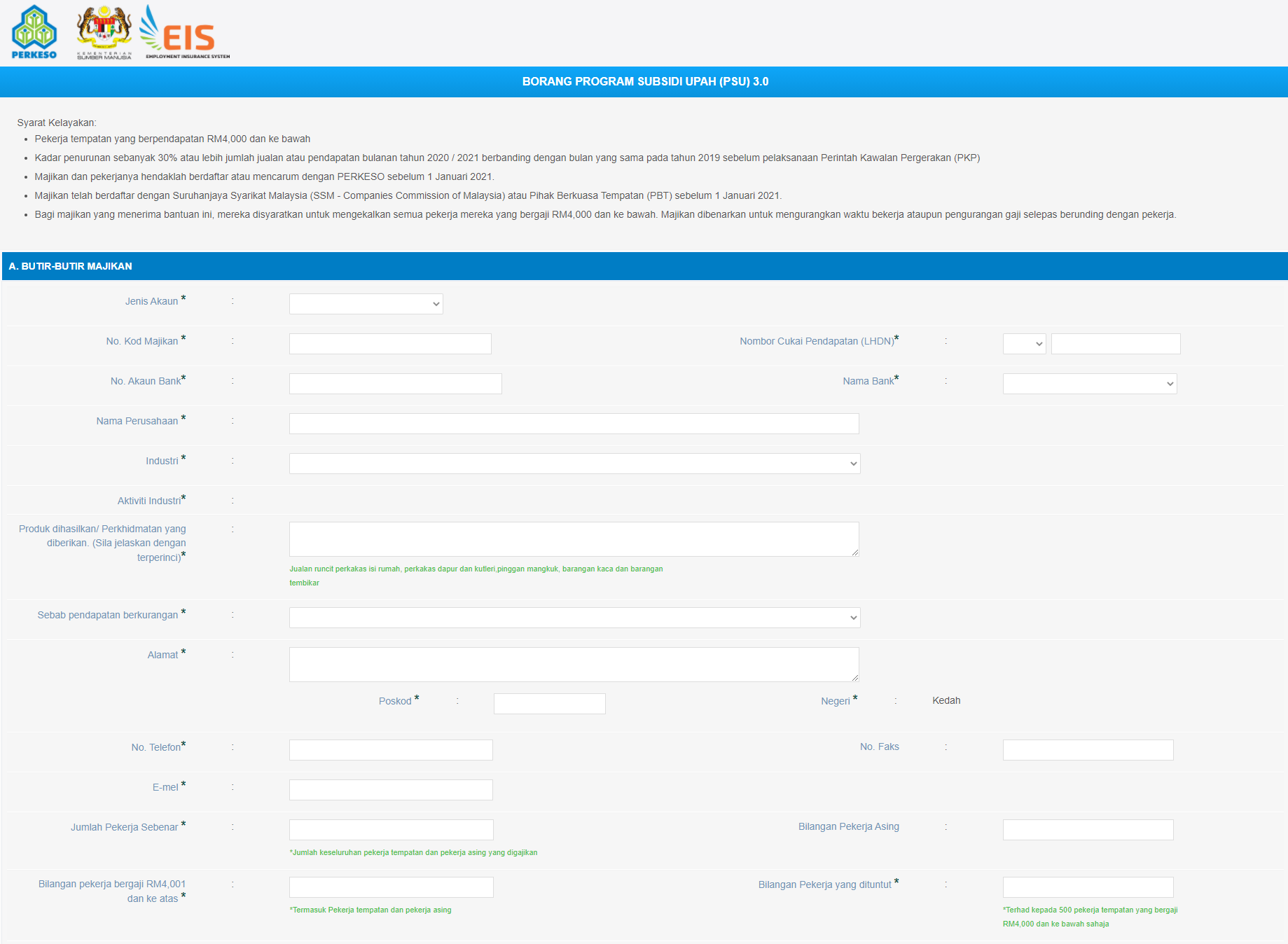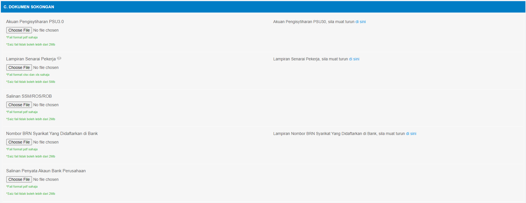 ※ 需5份文件:Akuan Pengisytiharan PSU3.0、Lampiran Senarai Pekerja、Salinan SSM/ROS/ROB、Nombor BRN Syarikat Yang Didaftarkan di Bank、Salinan Penyata Akaun Bank Perusahaan。