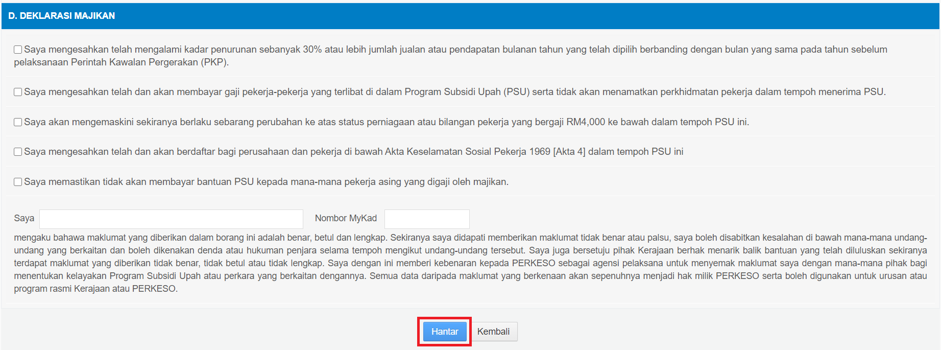步骤5:在Deklarasi Majikan 栏目下打勾所有的选项,并填上自己的名字和身份证号码,点击「 Hantar」。
