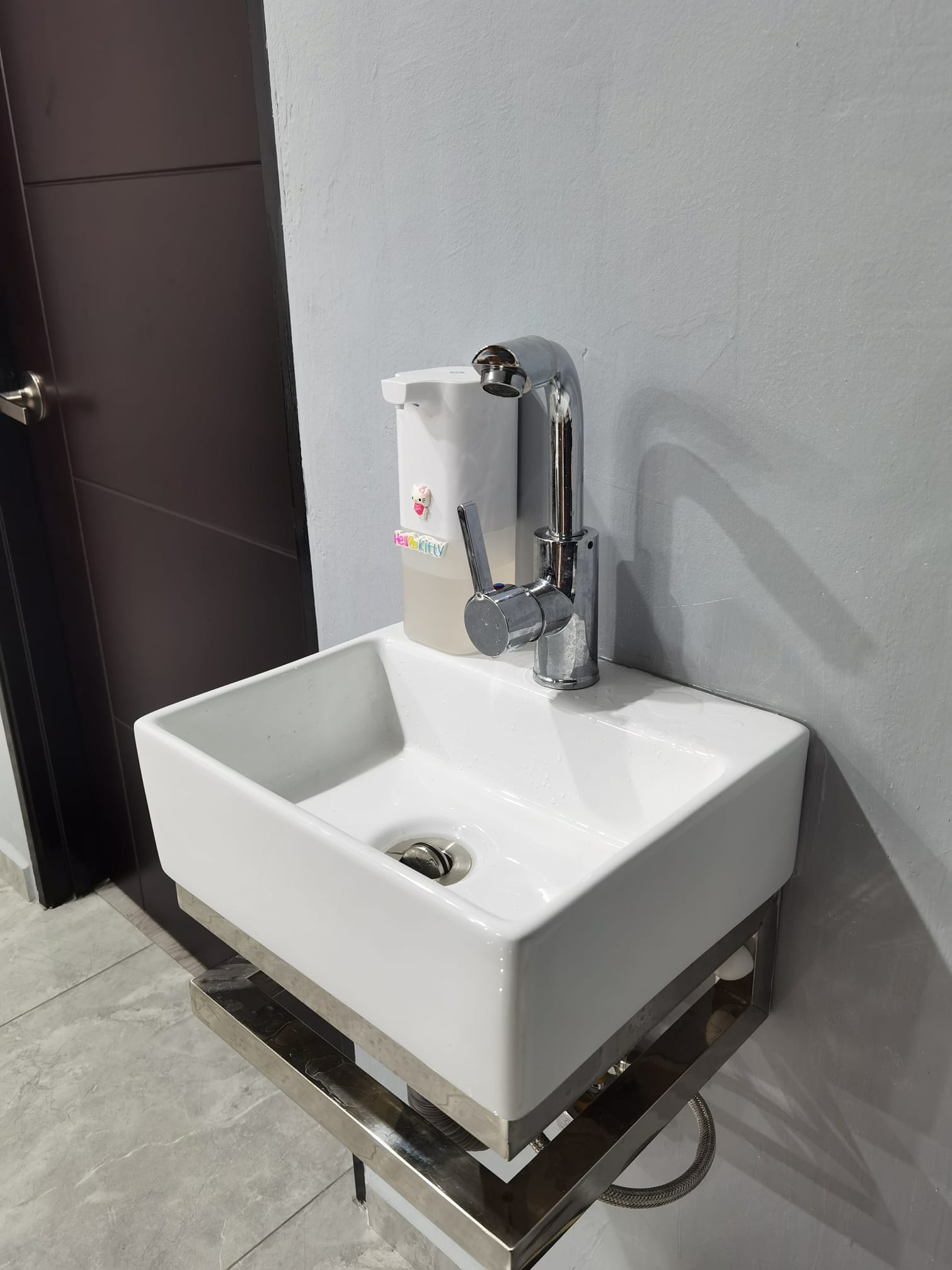 ▼ 这边是靠近饭厅的地方,又是一个角落,所以我在这边安装了一个迷你洗手盆,是要培养孩子吃饭前洗手的习惯。这真的是超迷你版。