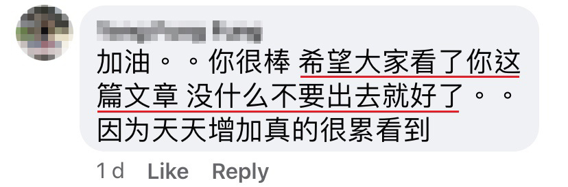 请大家要好好照顾自己,保护自己,没事不要出门,因为病毒不懂什么时候会看上你跟你做朋友。防疫中心会隔绝你跟外面的世界,没得见家人、没得见朋友、没得吃你想吃。