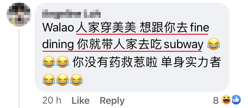 之前我问她要吃什么,她也没有表明,只是笑笑讲:「你喜欢吃什么就吃什么咯,我都可以。」然后那天我放工就去她家载她,她还穿到几美下。我就这样开车开到一家常去的Subway,她下了车一直东张西望,问我:「所以我们要吃哪一间?」我指着门口:「Subway咯。」