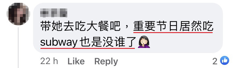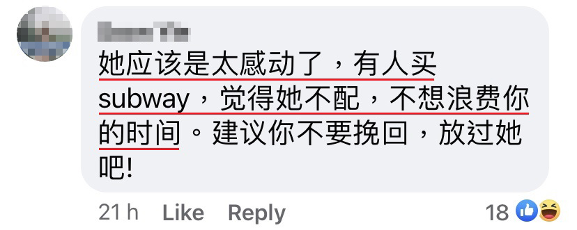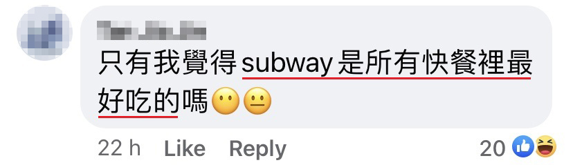 她好像很惊讶的问我:「Subway?你认真的吗?」我讲:「对啊,我很喜欢吃Subway啊,你讲我喜欢吃什么就吃什么的嘛,你记得吗?」