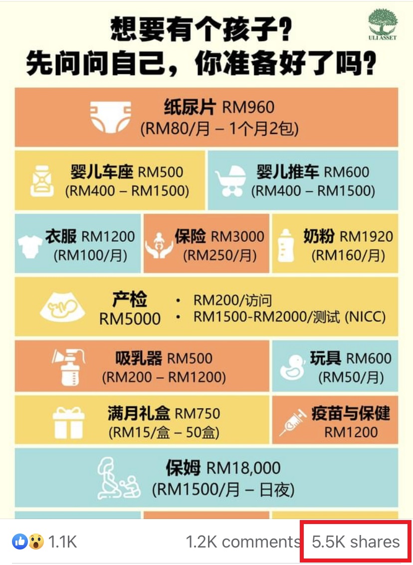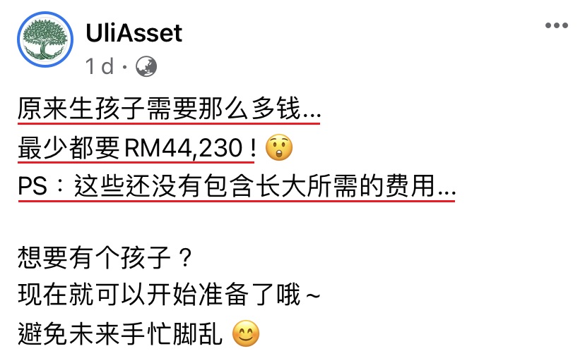 日前大马一个金融服务的面子书专页“UliAsset”分享一张图引发高度讨论,生孩子所需的基本15个消费竟然就高达 RM44,230!