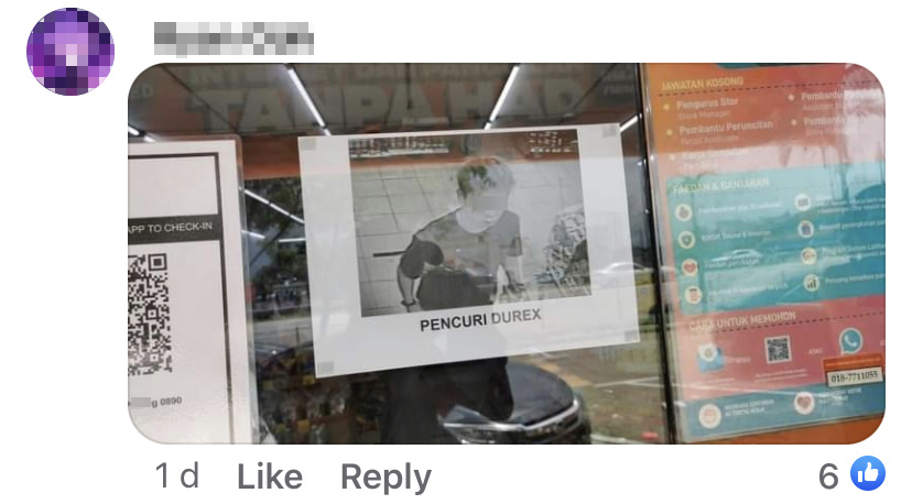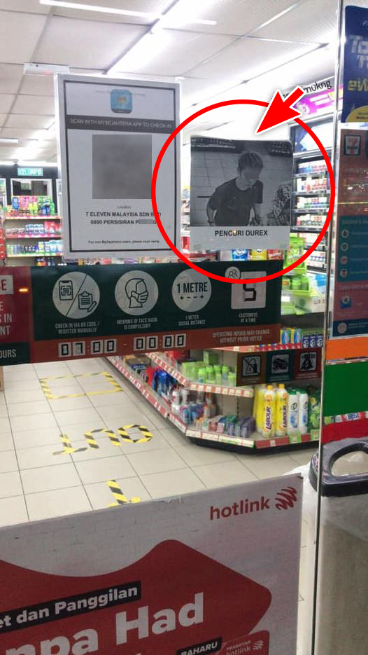▼ 那就是贴在 MySejahtera 旁边的一张黑白poster啦~这张poster上的照片,相信是从监控器捕捉下来的画面,可以清楚地看到一名年轻男子的帅气模样。然而下面的字才是最大的重点!照片下方写着的是:「偷了Durex避孕套的小偷(Pencuri Durex)」!
