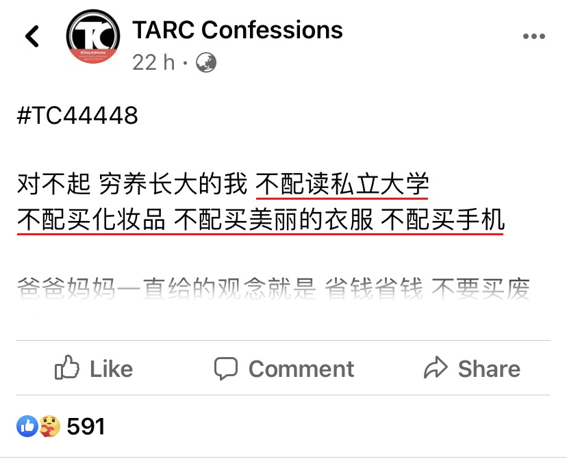 近日,大马一名女大生在“TARC Confessions”面子书PO文发泄,从小被穷养的她至今连保养品都没买过,读私立大学还被亲戚看不起,觉得自己做什么都不配!