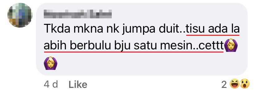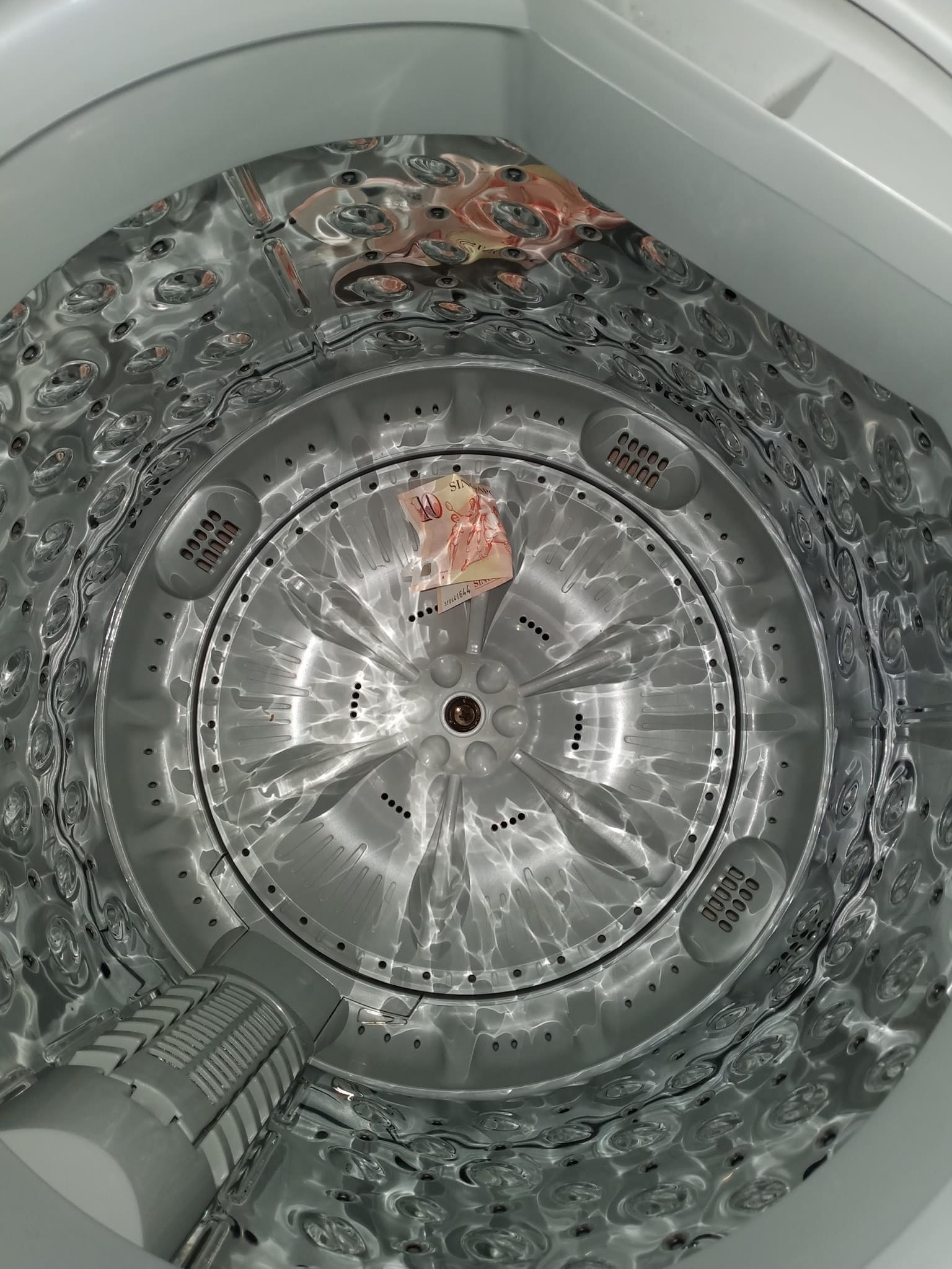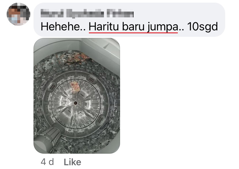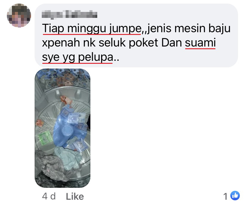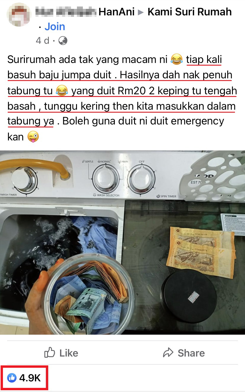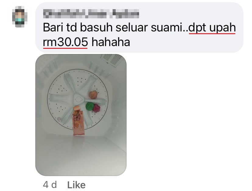 帖文写道:「你们做为家庭主妇有没有遇到同样的情况?每天洗衣服都会找到钱。我目前已经快要收满一个小扑满了。还有2张RM20还在洗衣机里洗着,等下干了我再把它收进我的小扑满。有需要的时候,可以用这些钱来应急了!」