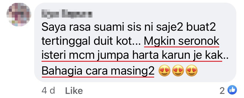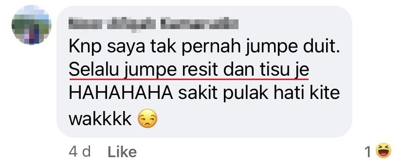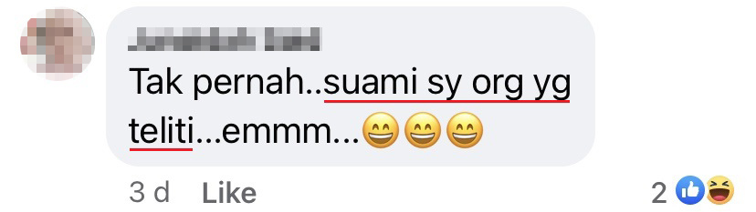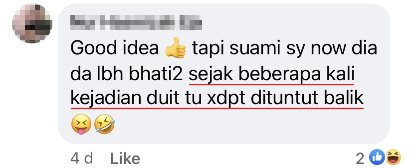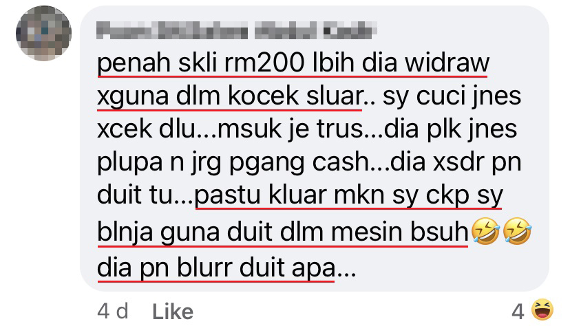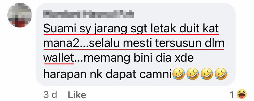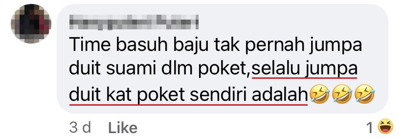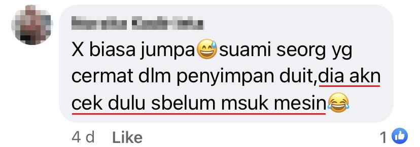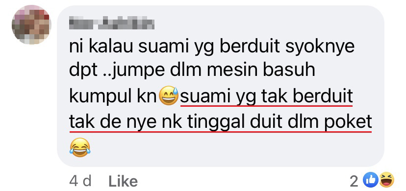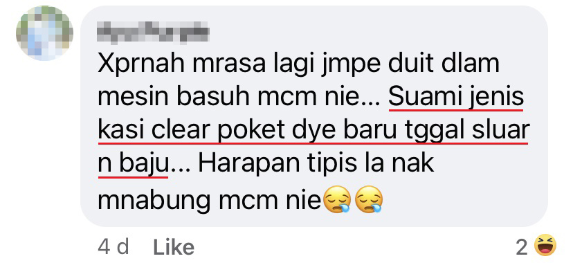 ▼ 憨憨的老公!「他曾经去银行领了RM200然后放进口袋,我洗衣服的时候发现了就跟他说,我把我从洗衣机捡到的钱花掉了,他还不知道是什么钱。」