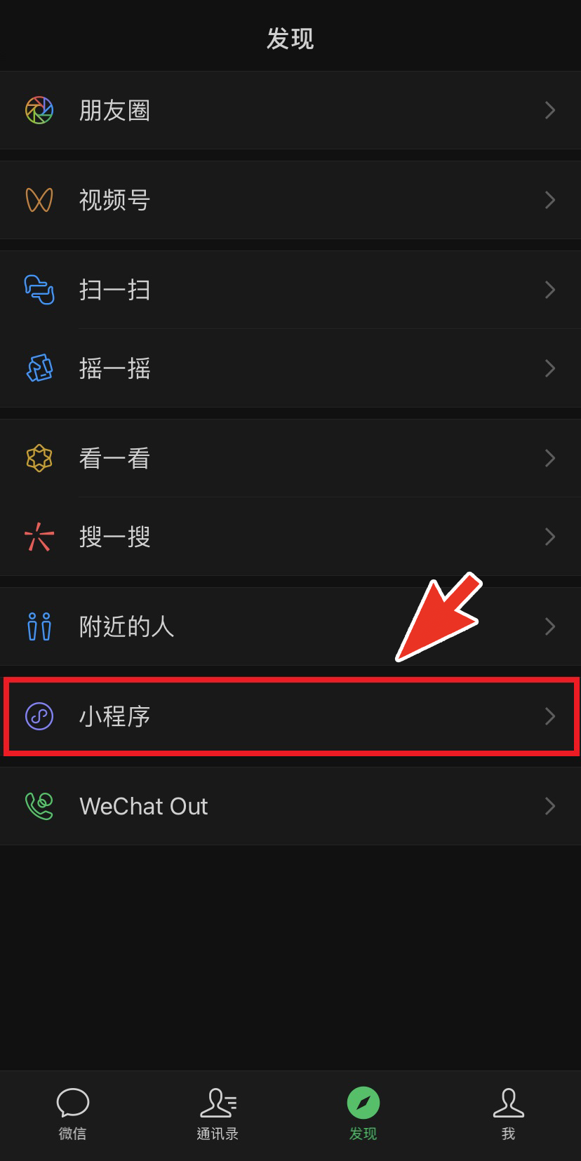 ▼ Step 1:打开微信,从【发现】选择【小程序】。