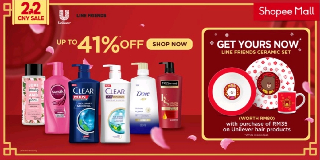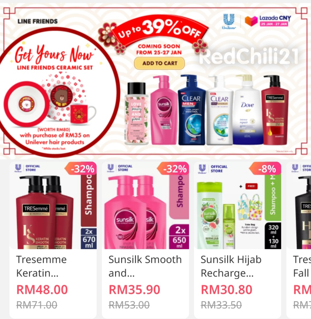 购买RM35 或以上Unilever 头发护理产品,可免费获得Line Friends 碗盘杯套组!护发产品还可享有高达39%折扣!
