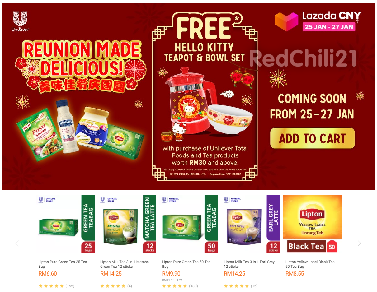 购买RM38 或以上Unilever 食品,可免费获得Hello Kitty 茶壶+碗套组