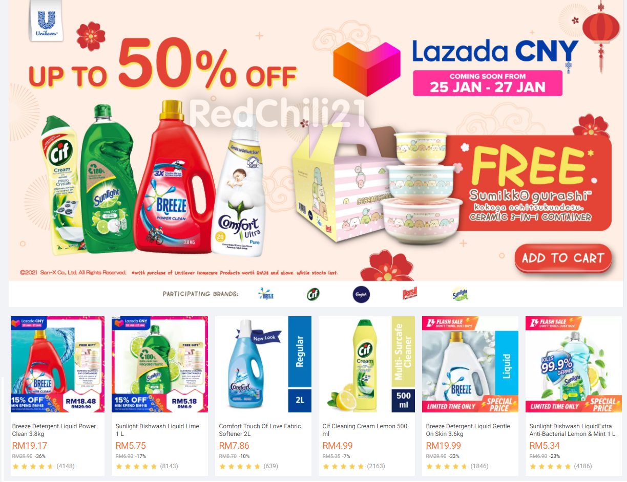 购买RM38 或以上Unilever 清洁用品,可免费获得Sumikko Gurashi 陶瓷碗套组!指定清洁用品可享有高达50%折扣优惠!