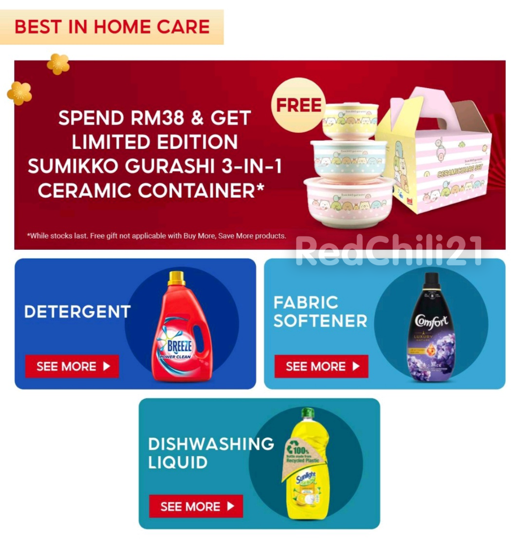 购买RM38 或以上Unilever 清洁用品,可免费获得Sumikko Gurashi 陶瓷碗套组!指定清洁用品可享有高达50%折扣优惠!