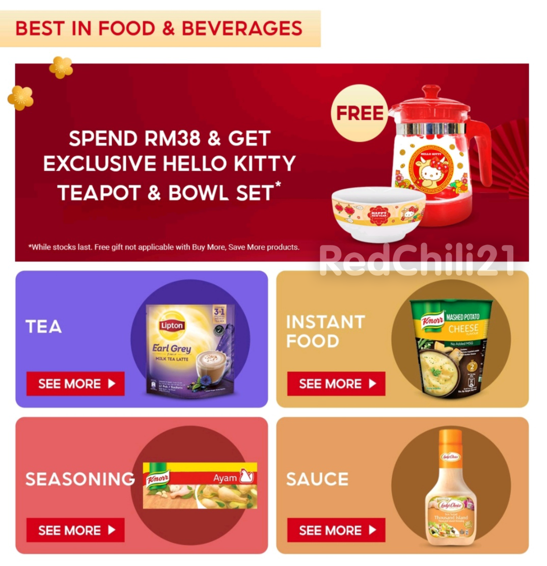 购买RM38 或以上Unilever 食品,可免费获得Hello Kitty 茶壶+碗套组