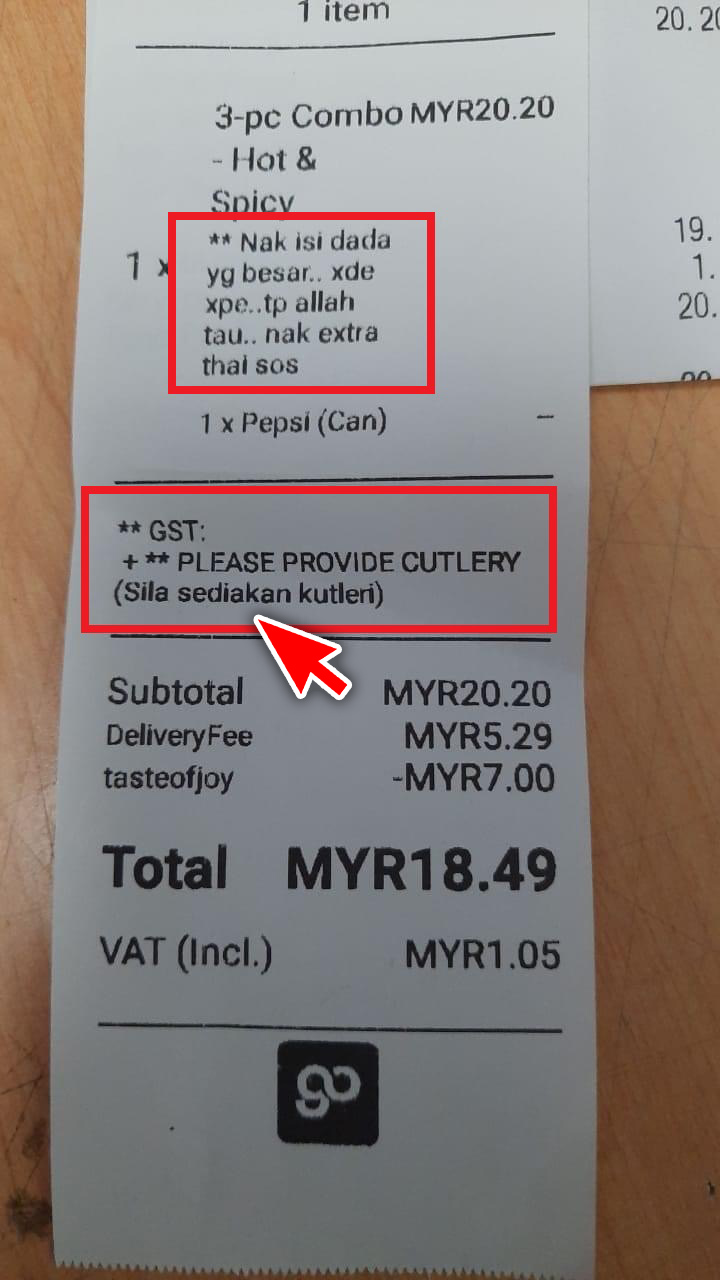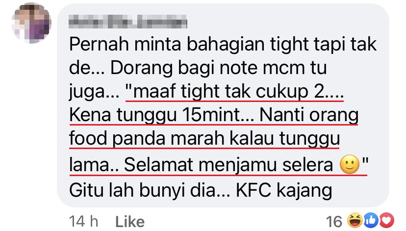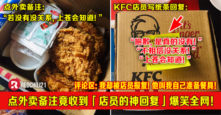 这名大马网友日前就在面子书群组分享自己的经历,点肯德基炸鸡时也同样做了备注,没想到意外收到店员回复她的小字条!