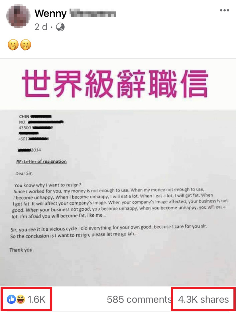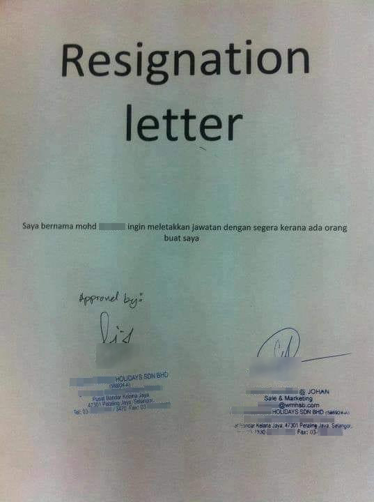 近日大马网友在面子书分享一封辞呈,内容之搞笑让网友们忍不住share了又share!