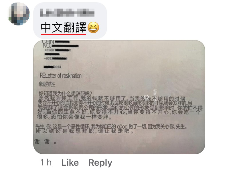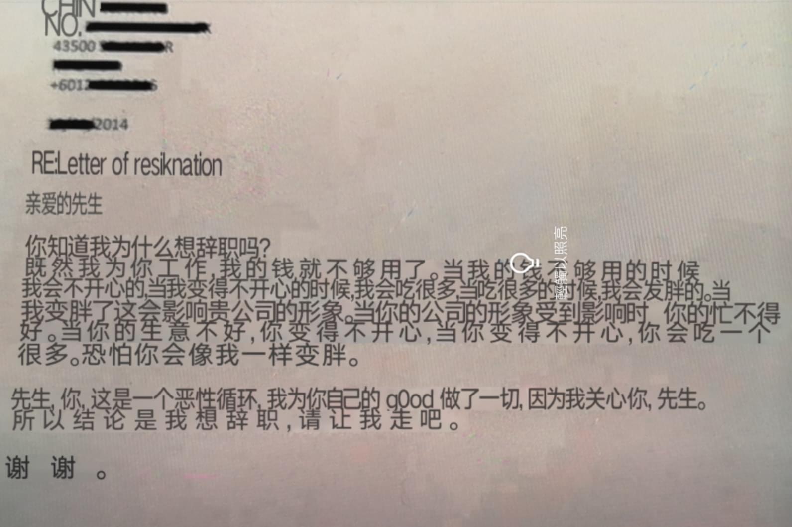 ▼ 这让网友们想起了另一封早前疯传的辞职信。「我名叫某某某,我想要马上辞职,因为有人“buat”我。」