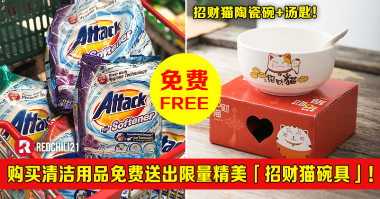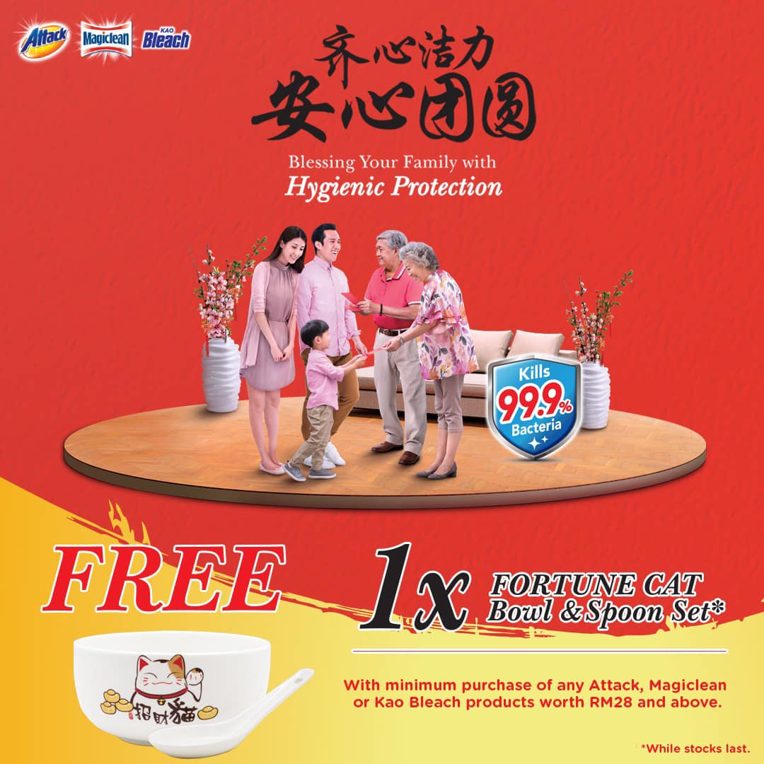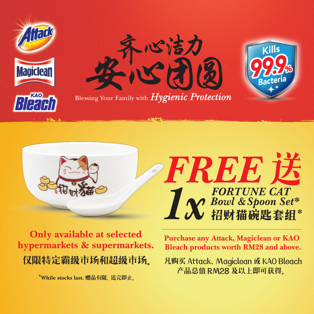 促销活动:购买RM28 或以上Attack,Magiclean 或Kao Bleach 清洁用品,免费获得招财猫碗具