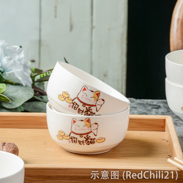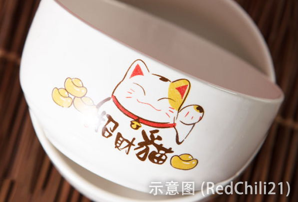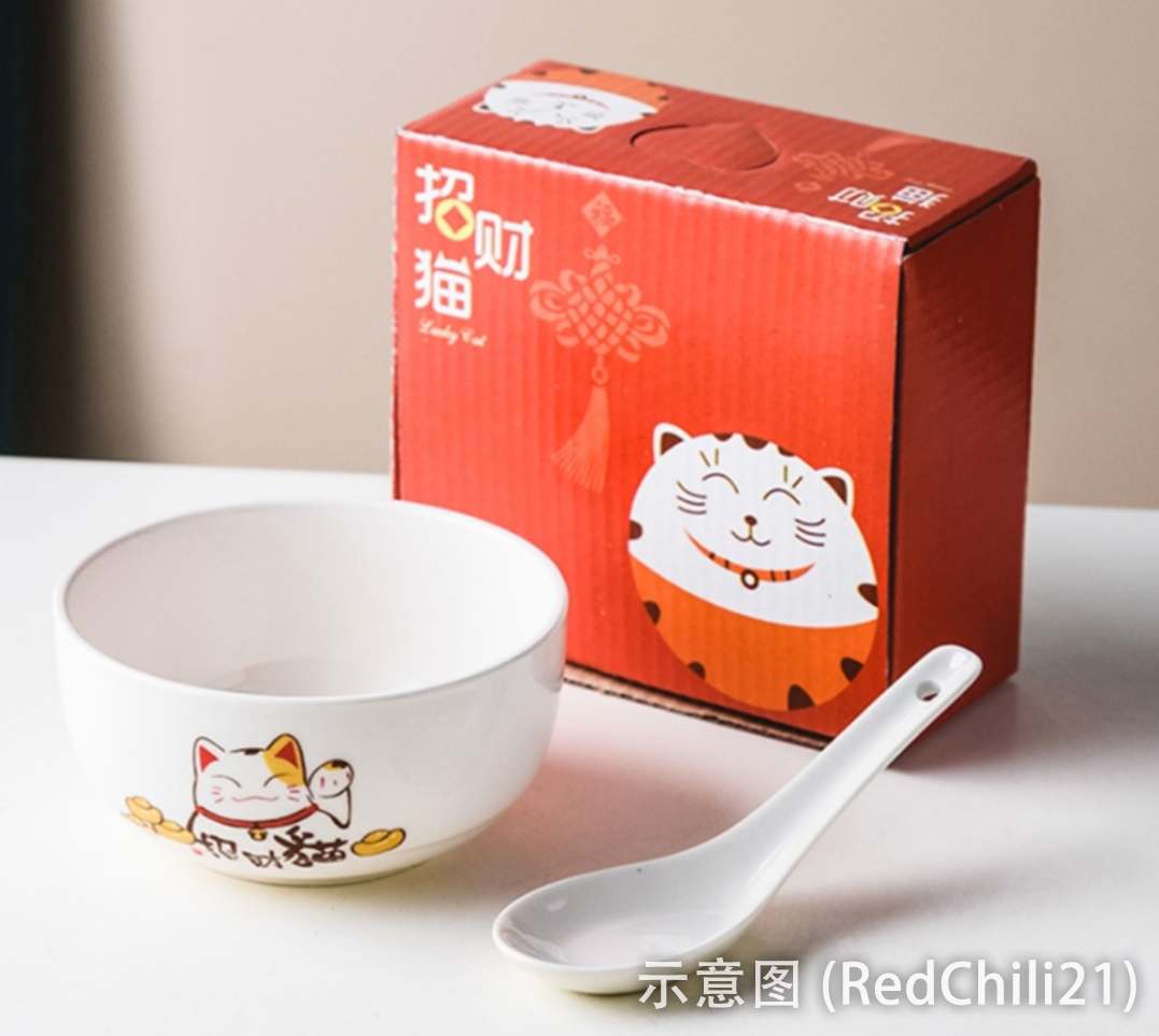 ▼ 招财猫碗具有一个陶瓷碗和汤匙: