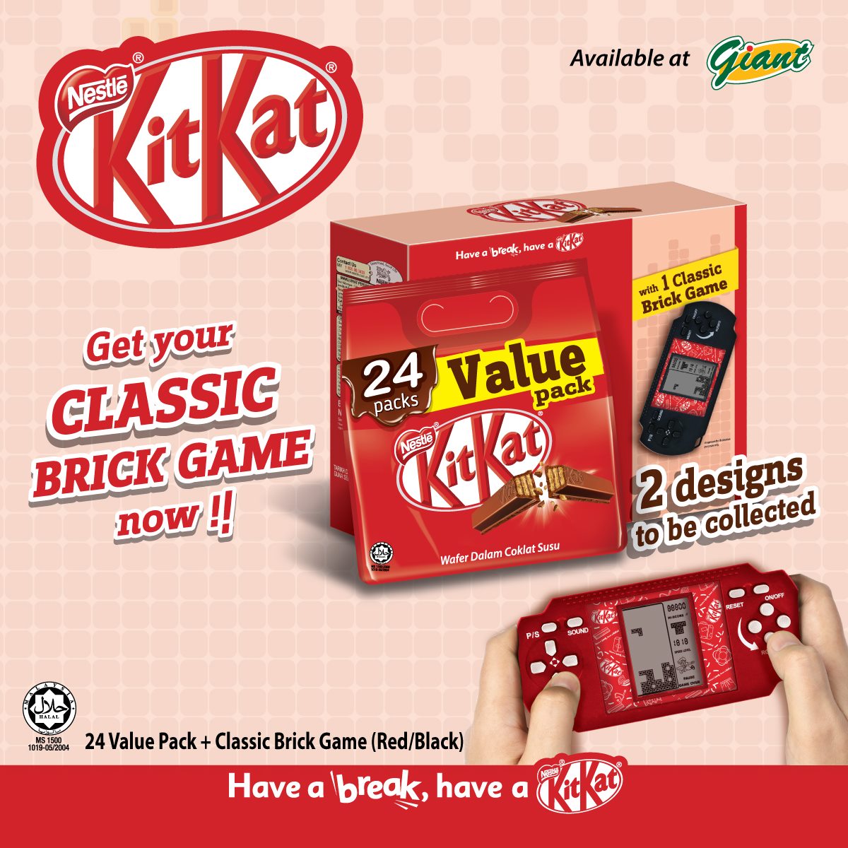只要你在大马超级市场Giant 购买KitKat 24 Value Pack 包装的巧克力,附送一个限量版游戏机(classic brick game)!