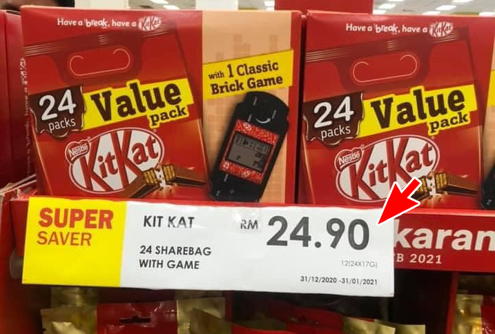 根据网友透露一盒KitKat 24 Value Pack 包装的巧克力售价为RM24.90!盒子内随机附送一个游戏机!