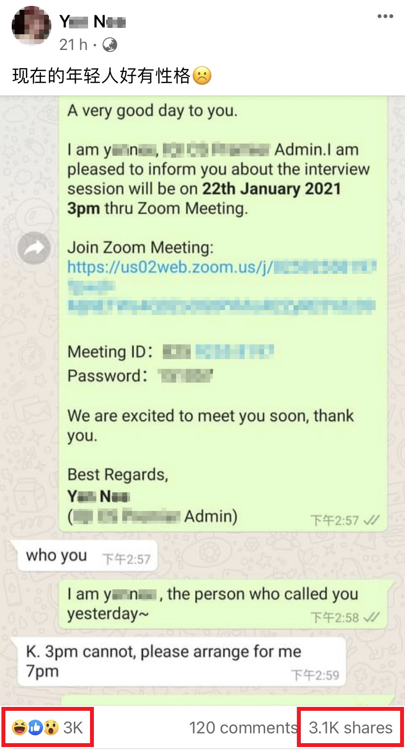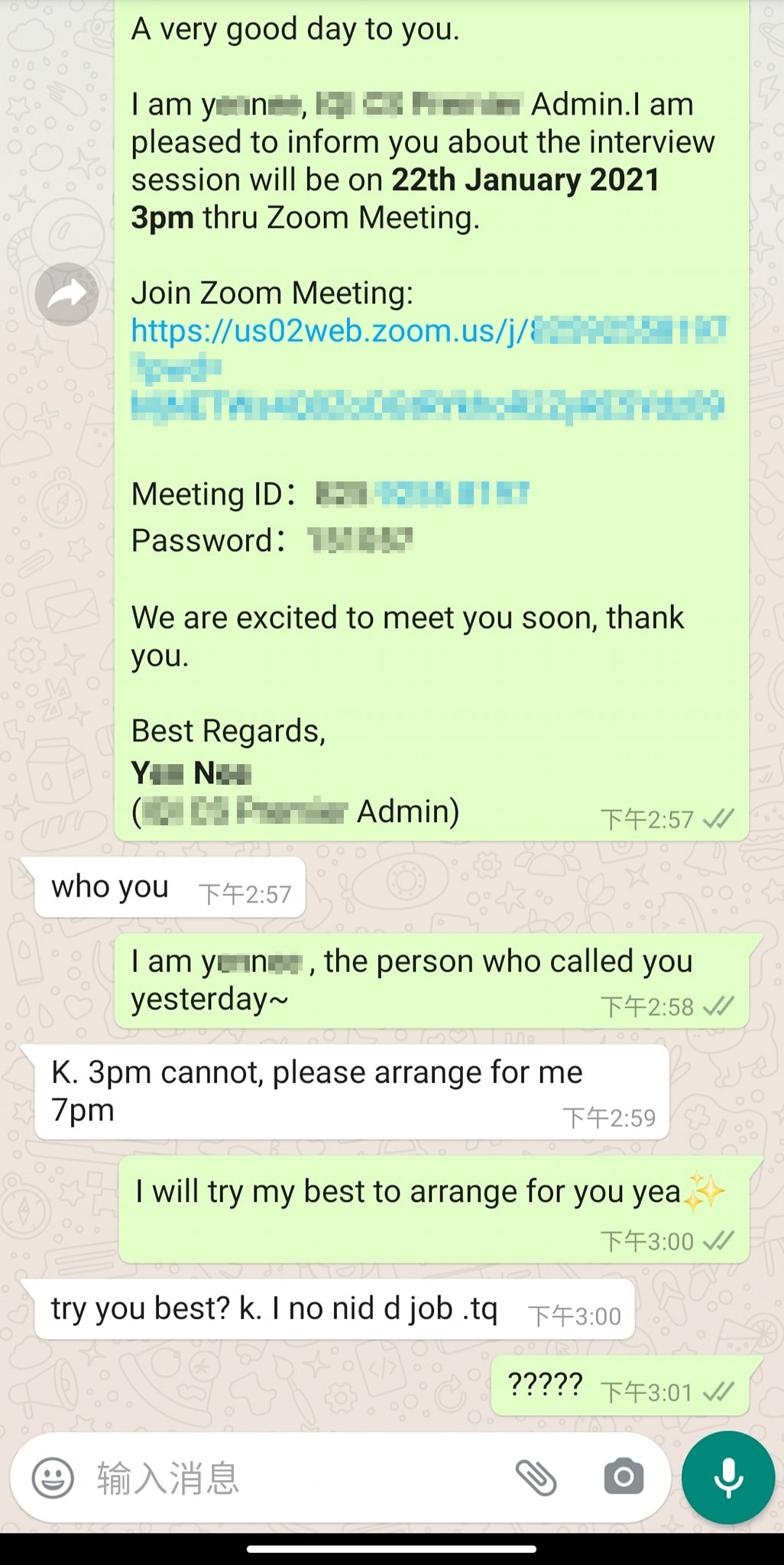 Admin:「祝您有愉快的一天。我是XX公司的行政人员,我很开心地通知您,面试环节将在2021年1月22日下午3点,通过 Zoom Meeting 进行。期待与您见面,谢谢!」(Admin把链接、ID以及密码发给该求职者。)