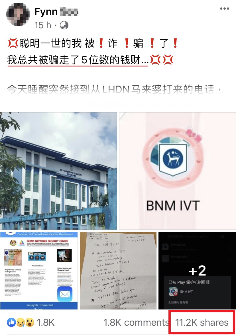 昨天面子书疯传一则帖子,一名大马女子发文叙述自己被诈骗的过程,损失多达5位数!该帖子在不到1天内,就已经累计超过11,000次分享!