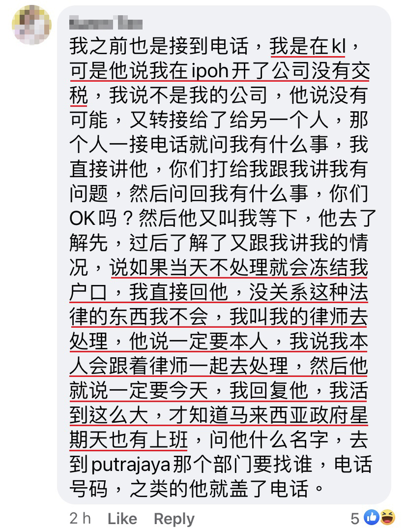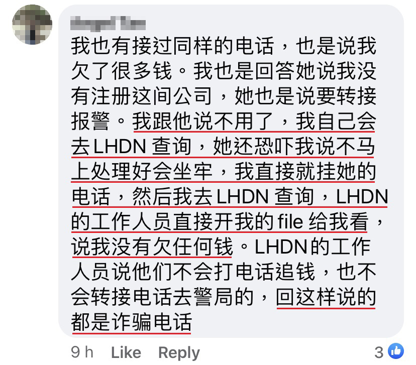 今天睡醒,突然接到从LHDN打来的电话,说我有Hutang Cukai(欠税)RM40,501.90,是一间注册在我名下的Kuantan公司!连SSM号码所有详细资料都给的非常仔细。当然我回答这不是我的公司,我也没有注册过SSM,更没有欠款!她说那就是有人盗用了我的IC,必须要去Kuantan报警,但是我人在Johor,哪里可能去!