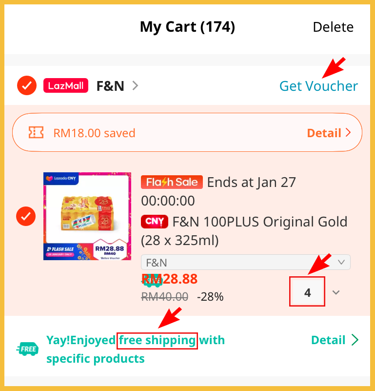 ❷ 为什么一定要4箱呢?因为F&N 店家有给折扣券啊!买上RM100 就能折扣RM18!