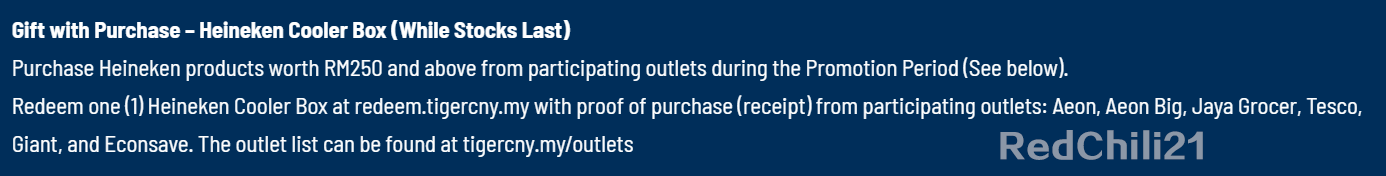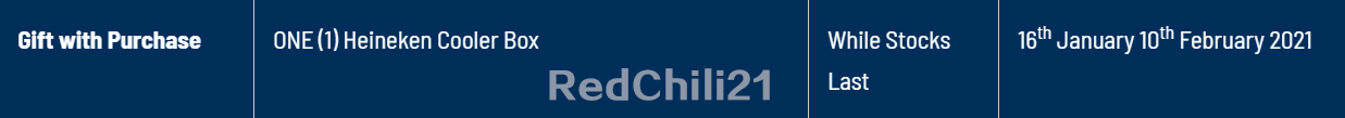从即日起只要你指定超级市场购买RM250 或以上的Heineken 啤酒,就可获得一个限量版Heineken 保温箱!
