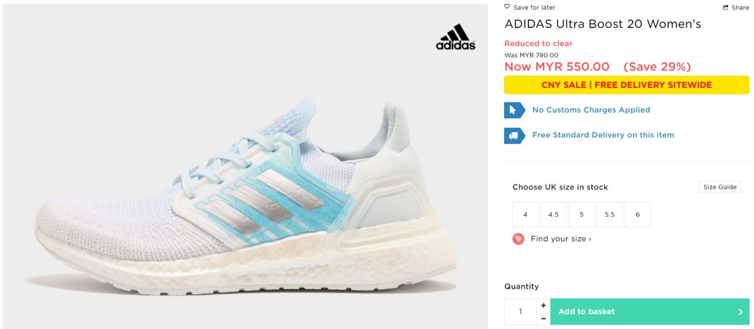 ▼ ADIDAS Ultra Boost 20 Women’s【折扣29%】- 只需RM550(原价 RM780)