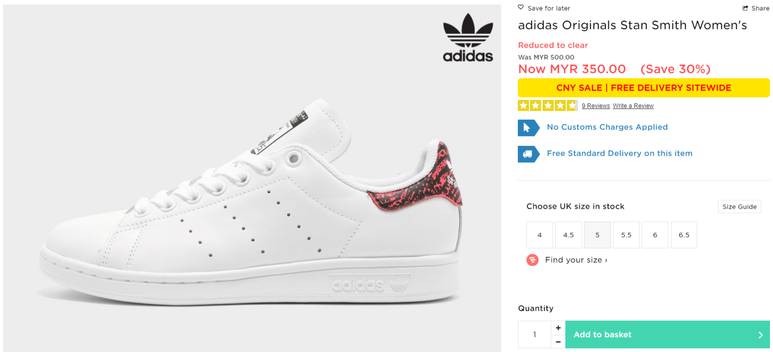 ▼ adidas Originals Stan Smith Women’s【折扣30%】- 只需RM350(原价 RM500)