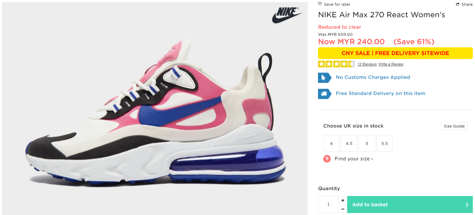 ▼NIKE Air Max 270 React Women’s【折扣61%】- 只需RM240(原价 RM609)