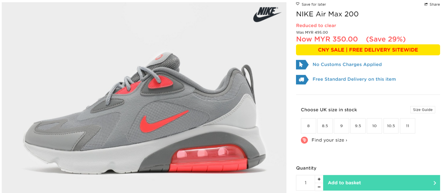 ▼ NIKE Air Max 200【折扣29%】- 只需RM350(原价 RM495)