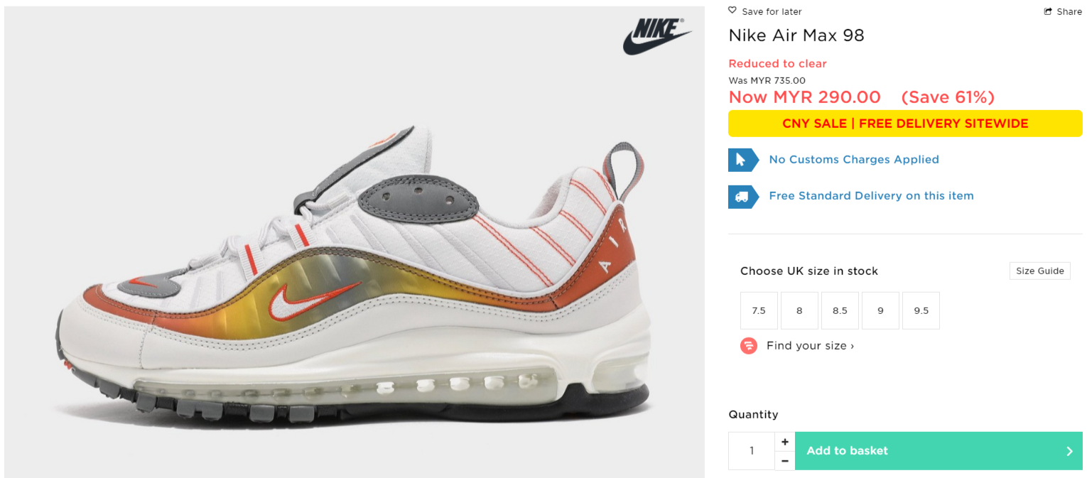 ▼ Nike Air Max 98【折扣61%】- 只需RM290(原价 RM735)