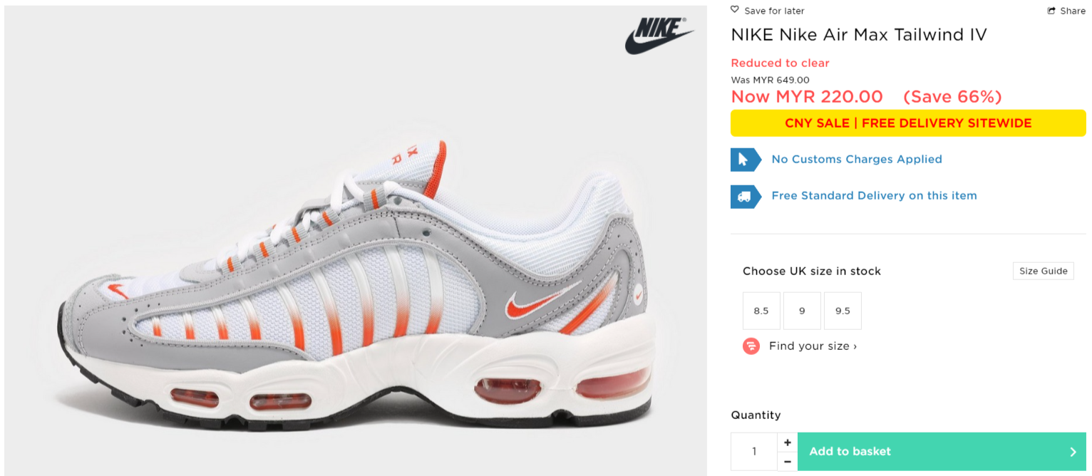▼ NIKE Nike Air Max Tailwind IV【折扣66%】- 只需RM220(原价 RM649)