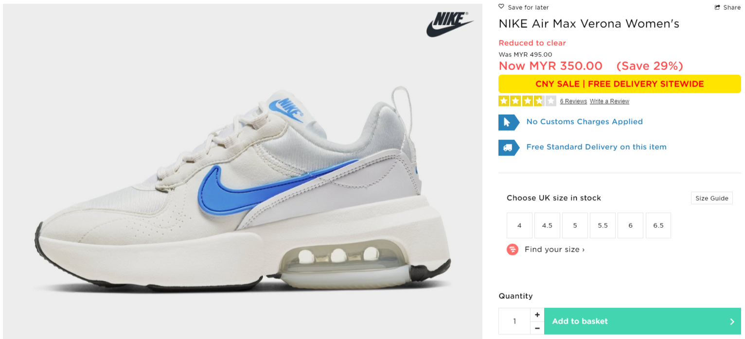 ▼ NIKE Air Max Verona Women’s【折扣29%】- 只需RM350(原价 RM495)