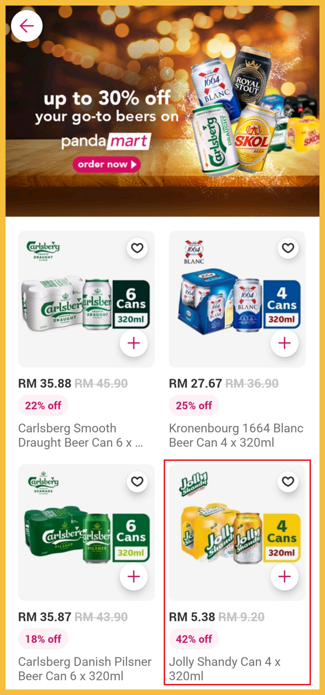 步骤 2:点击「啤酒30%折扣」的优惠照片!然后,选择购买「Jolly Shandy Can 4 x 320ml」!