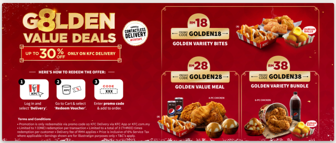 这项优惠是由KFC 官网和手机App 推出新春【Golden Value Deals】套餐大优惠!只要你输入有关Promo Code ,就可购买到3种不同美食套餐!