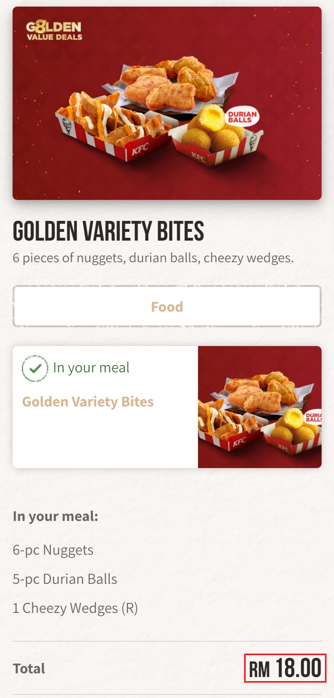 ▼ 此套餐包含:6片Nuggets + 5粒Durian Balls + 1份Cheezy Wedges(R)