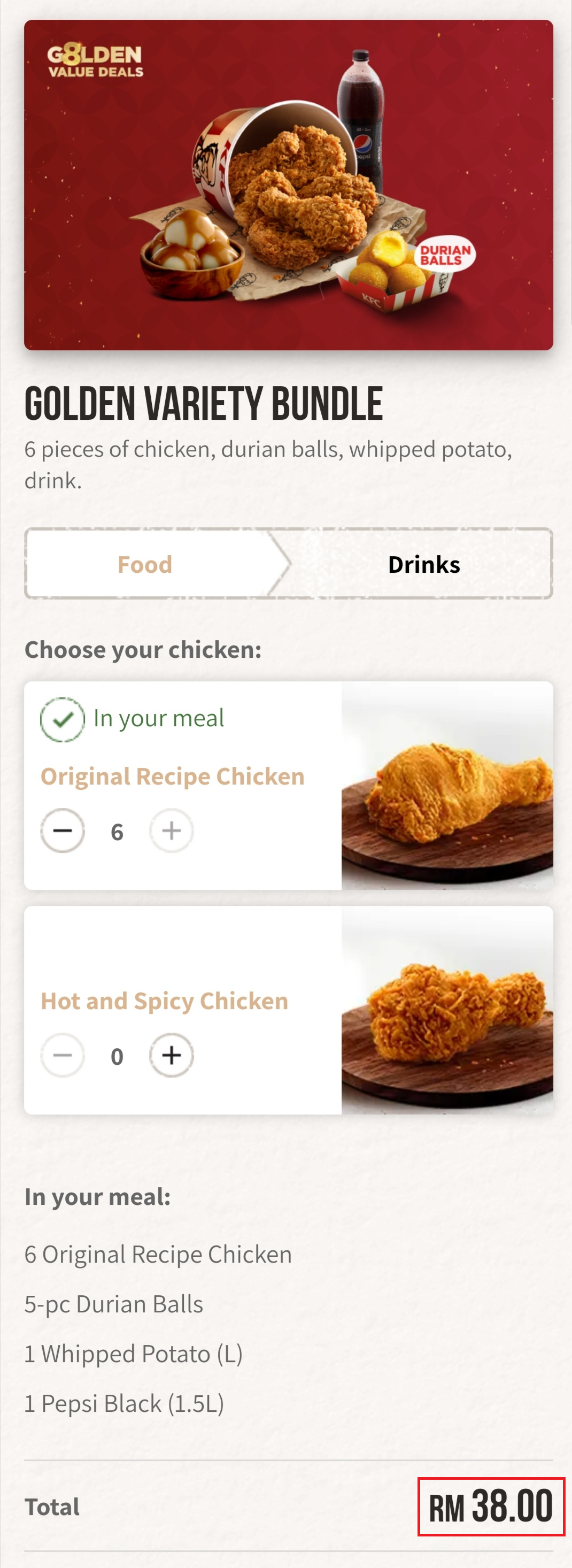 ▼ 套餐包含:6块炸鸡 + 5粒Durian Balls + 1份马铃薯泥(L) + 1罐1.5LPepsi Black