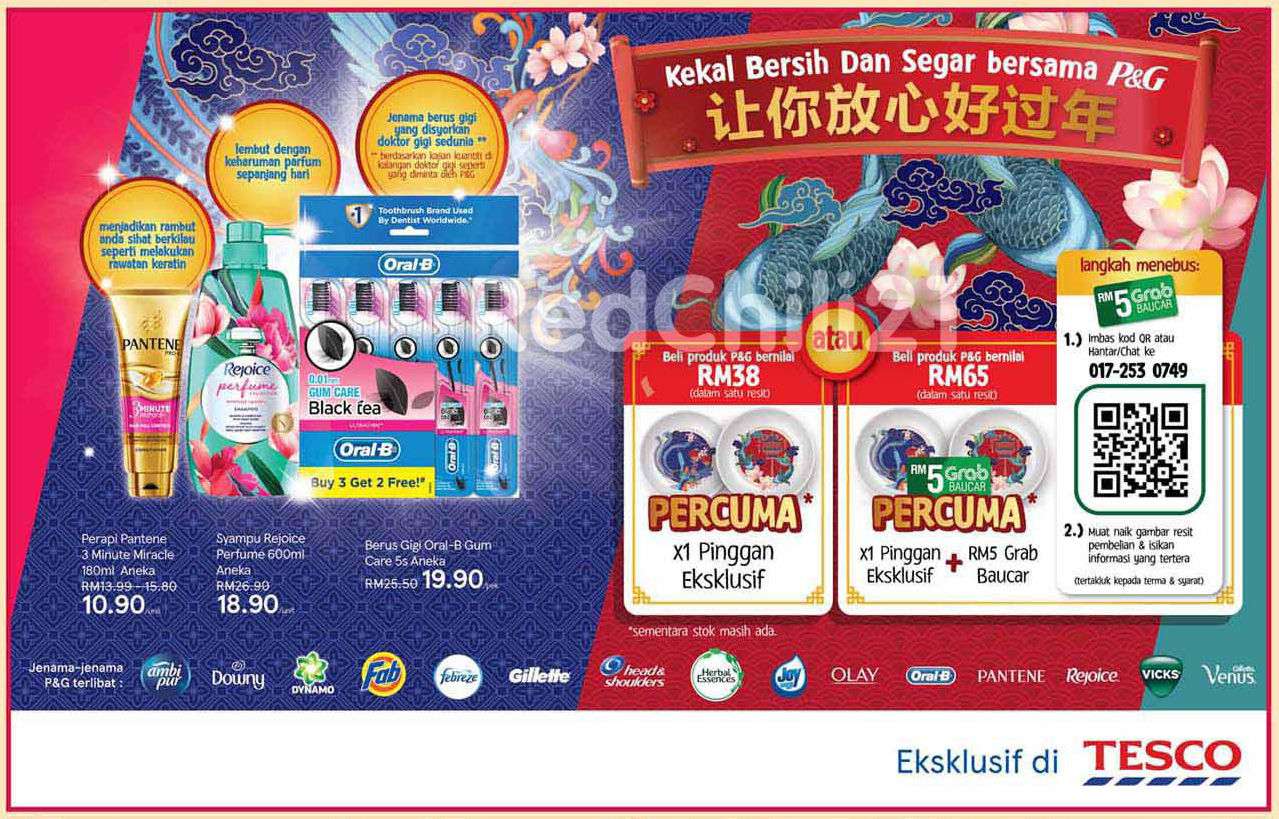 • 购买RM65 或以上P&G产品,可免费获得一个8寸大的吉祥喜庆餐盘和RM5 Grab 优惠券
