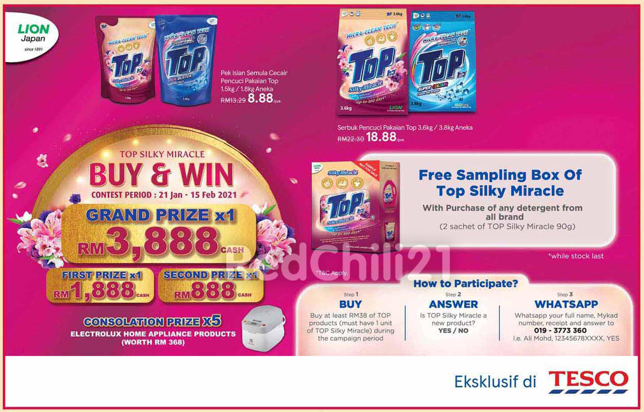 • 购买任何品牌的清洁剂,可免费获得2包90g TOP Silky Miracle