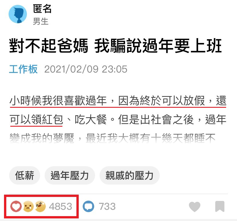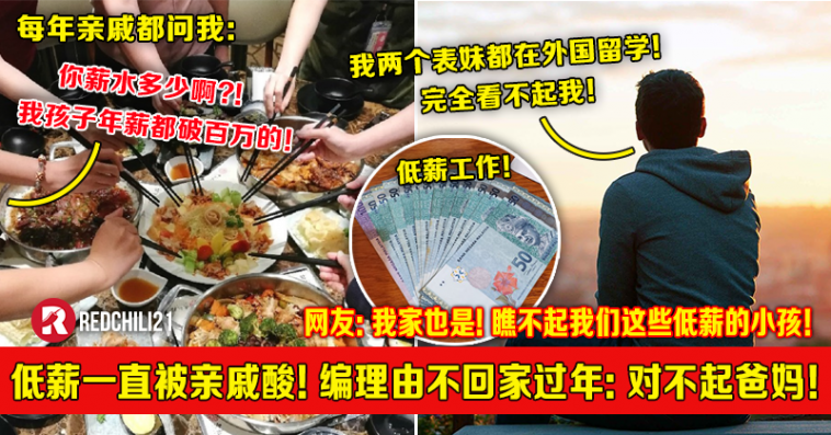 台湾一名男网友近日在网上PO文,骗爸妈今年新年因为需要上班所以不能回家,但其实真正的原因是他不愿回家面对那些瞧不起他低薪的亲戚们!